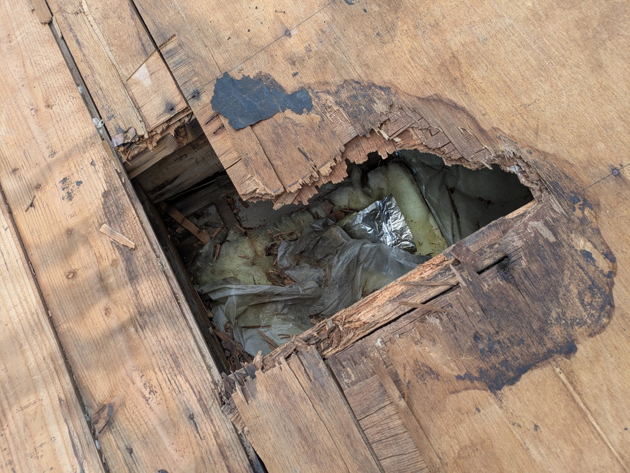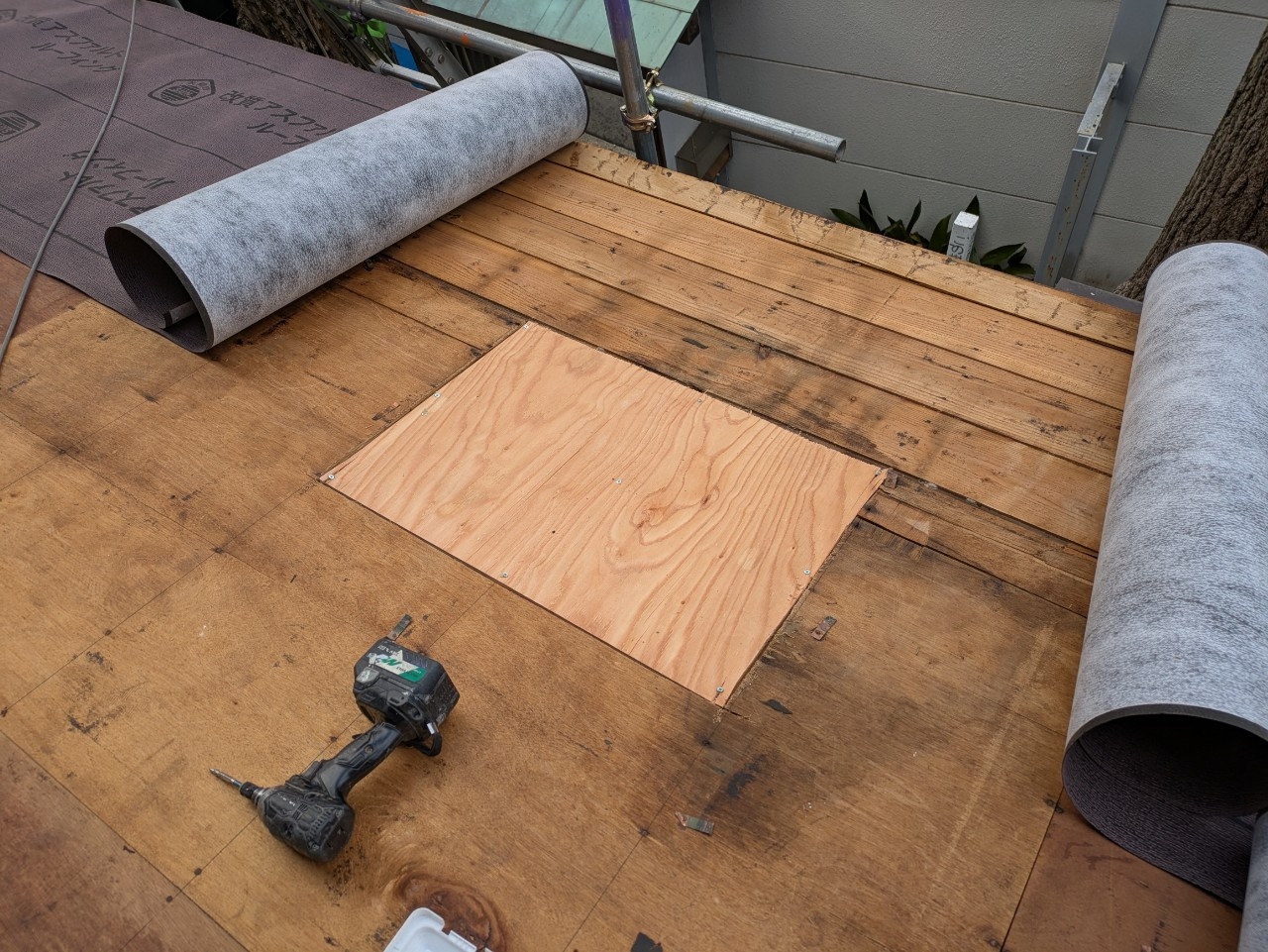 雨漏りを調べてみると屋根の下地板に大きな穴が。動物が作ったものと思いますが、、、